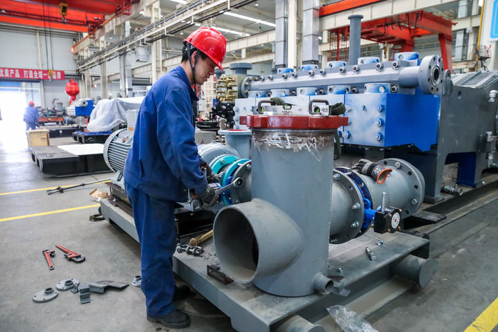8月6日,在位于兰州新区的兰州兰石集团有限公司装备公司生产车间,工作人员正在对承制的2600HP五缸泥浆泵进行总装。新华社记者 郎兵兵 摄