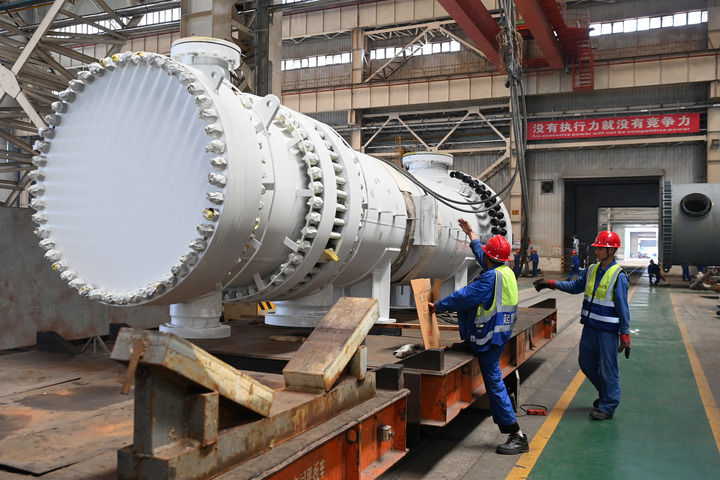 2024年7月25日,在兰州新区兰石集团高端装备产业园,工人在吊装储罐设备。新华社记者 范培珅 摄