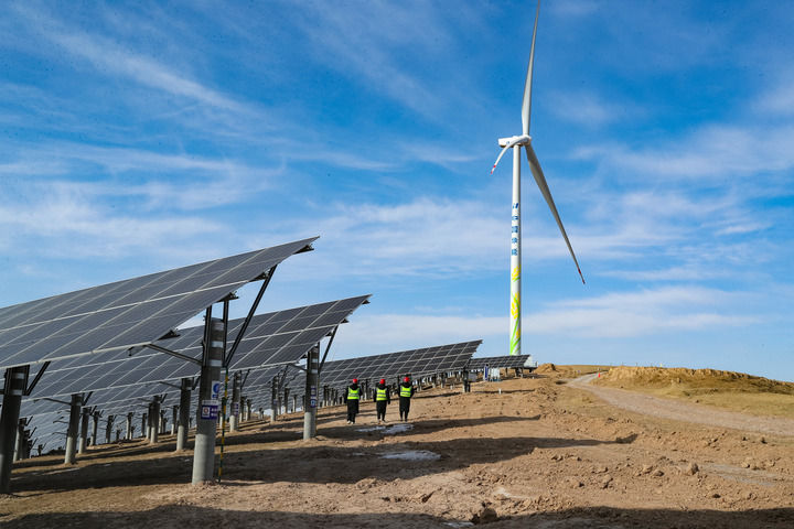 1月9日,在庆阳市环县小南沟乡华能庆阳600万千瓦风光综合新能源示范项目现场,工作人员检查安装完成的光伏组件。新华社记者 郎兵兵 摄