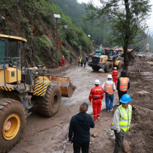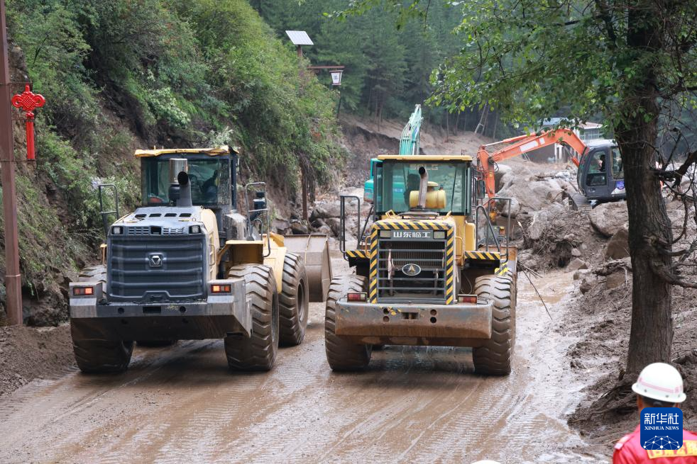 8月8日,救援人员在榆中县马坡乡山洪灾害现场抢修中断道路。新华社发(金万贵摄)