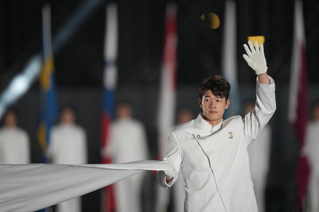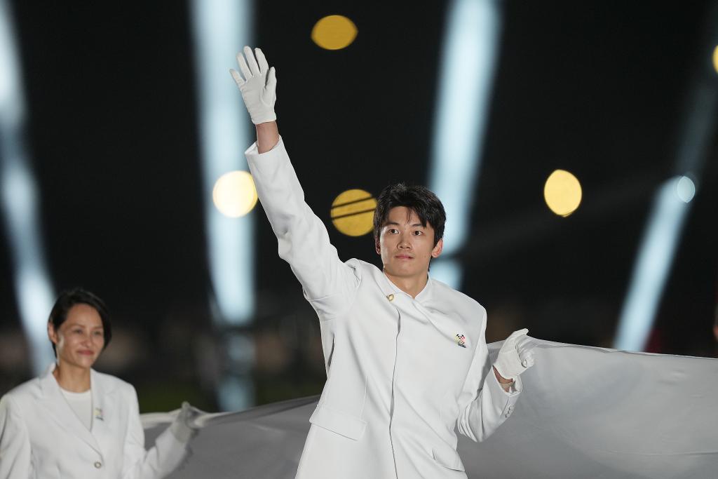 8月7日,国际奥林匹克委员会会旗执旗手潘展乐在开幕式上。新华社记者 刘坤 摄