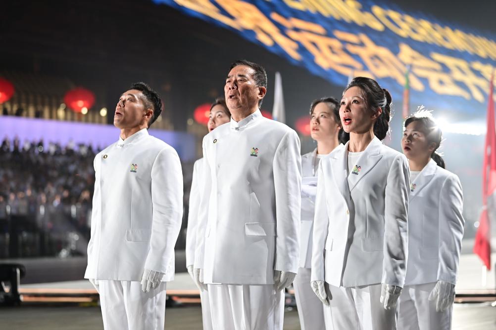 8月7日,孙志安(左三)、刘清漪(右一)和其他国际世界运动会协会会旗执旗手在开幕式上唱国歌。新华社记者 江汉 摄