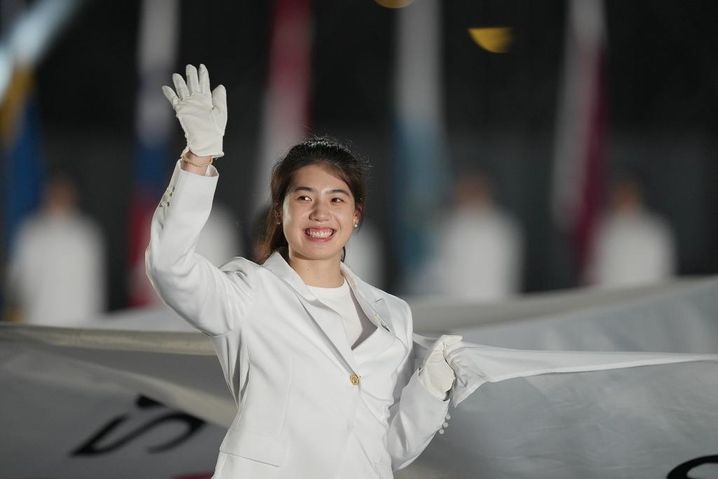 8月7日,成都世运会组委会会旗执旗手张雨霏在开幕式上。新华社记者 刘坤 摄