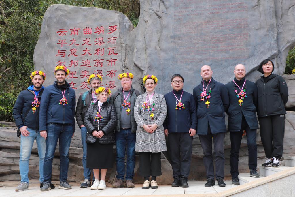2024年2月25日,意大利瓦尔邦迪翁市访问团在云南罗平九龙瀑布景区内的中意缔结友好瀑布纪念碑前合影留念。新华社发