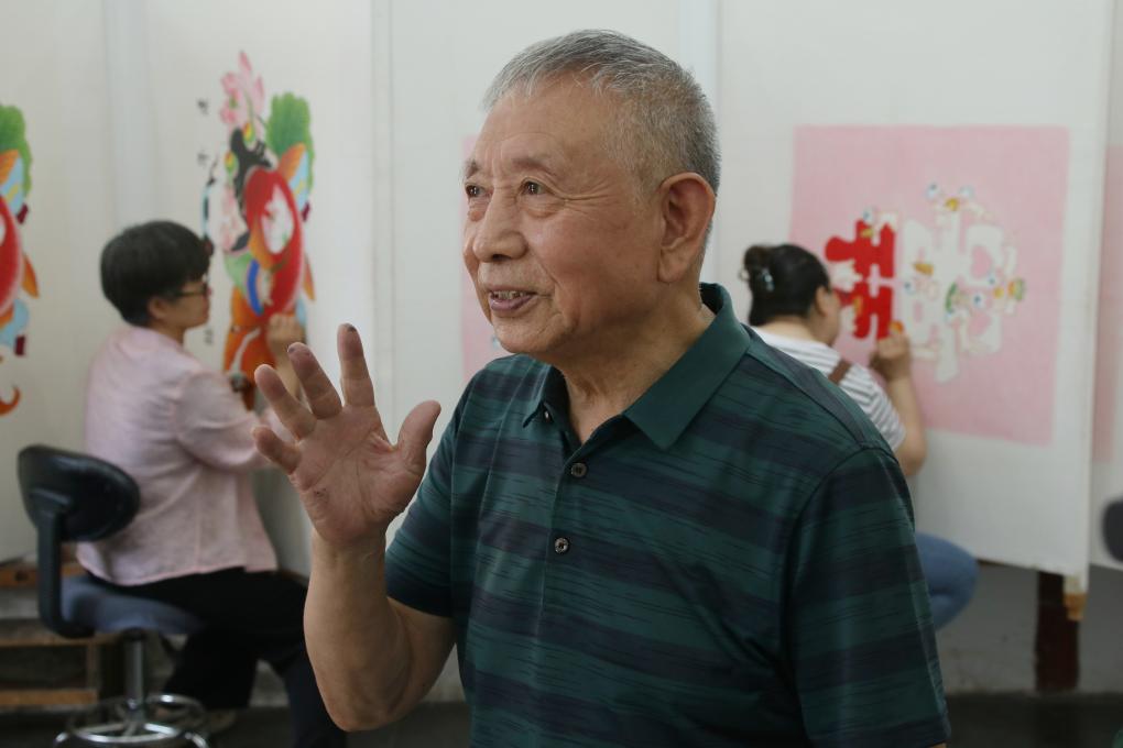 国家级非物质文化遗产项目杨柳青木版年画代表性传承人霍庆顺在讲述。新华社记者 曾晋 摄
