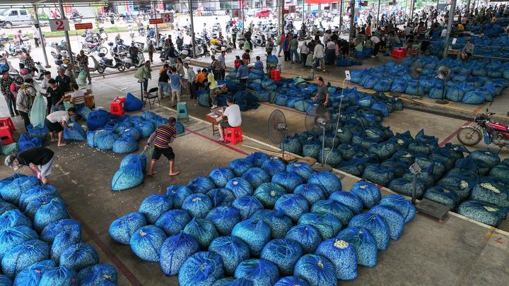在当地石井茉莉花交易市场,茶商在收购茉莉花(7月31日摄)。