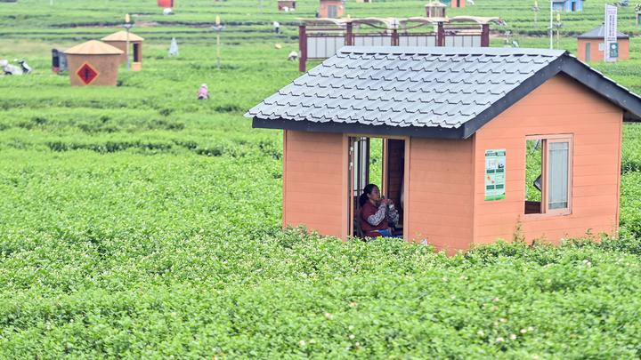 在横州市中华茉莉园,雷水平劳作后在小舍中休息调整(7月31日摄)。