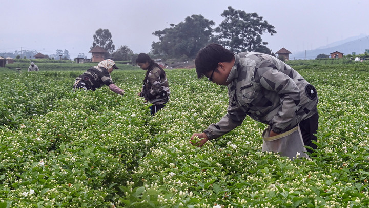 地处桂南的广西横州市,凭借富硒沃土与独特气候,拥有超过18万亩的茉莉花田,茉莉花(茶)产量占中国总产量80%以上,占世界60%以上,有“中国茉莉之乡”美誉。每年夏季是横州茉莉花采摘季,花田连片,芬芳漫溢,花农在花海中穿梭,一派繁忙景象。