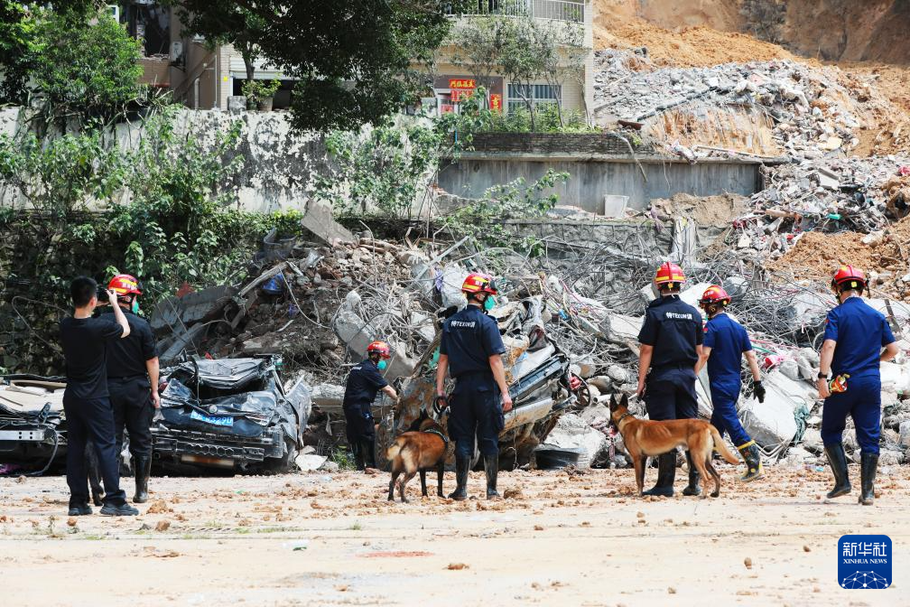 8月8日,广州市白云区山体垮塌现场,救援人员用搜救犬对被困车辆进行搜寻。 新华社记者 王瑞平 摄