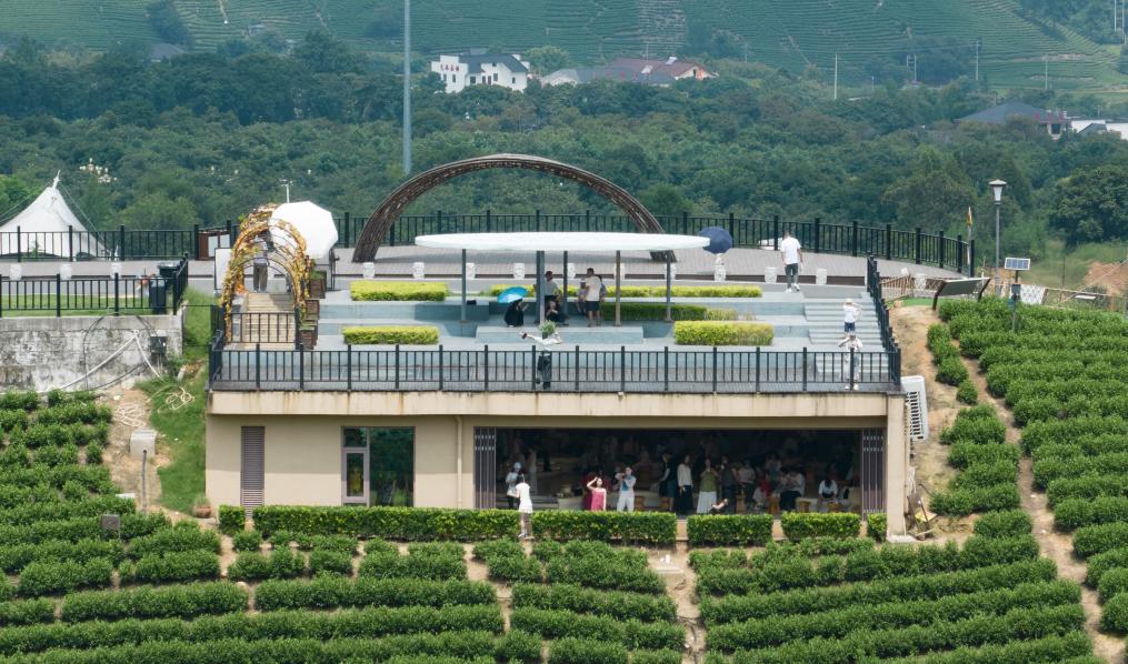八月已非传统采茶季,但浙江省安吉县溪龙乡黄杜村万亩茶园内仍旧绿意翻涌,游人如织。登临茶山制高点的开放式观景平台,一座建筑物的顶棚如一瓣叶片般舒展,轻盈灵动。这片“叶子”,正是当地村民引以为傲的白茶象征。