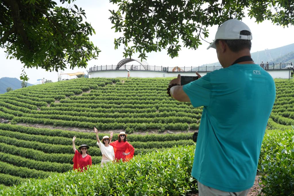 8月5日,游客在安吉黄杜村的万亩白茶园游览留影。新华社记者翁忻旸 摄