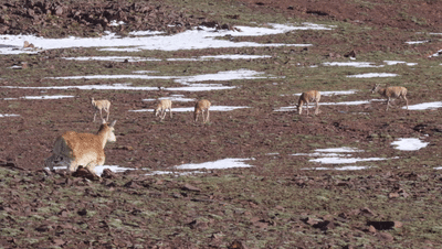 突然,离记者最近的一群藏羚羊旁边,出现了一只步履稍显僵硬的“藏羚羊”,脚步没有那么轻盈,体型也更丰满一些。不像其它藏羚羊一边啃草一边走动,这只“藏羚羊”一直昂着头,“小心翼翼”却又坚定执着地一点点靠近藏羚羊群。