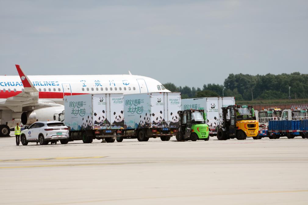 8月11日,大熊猫“芝士”与“芝麻”所乘航班平稳降落在哈尔滨太平国际机场。新华社记者 王松 摄