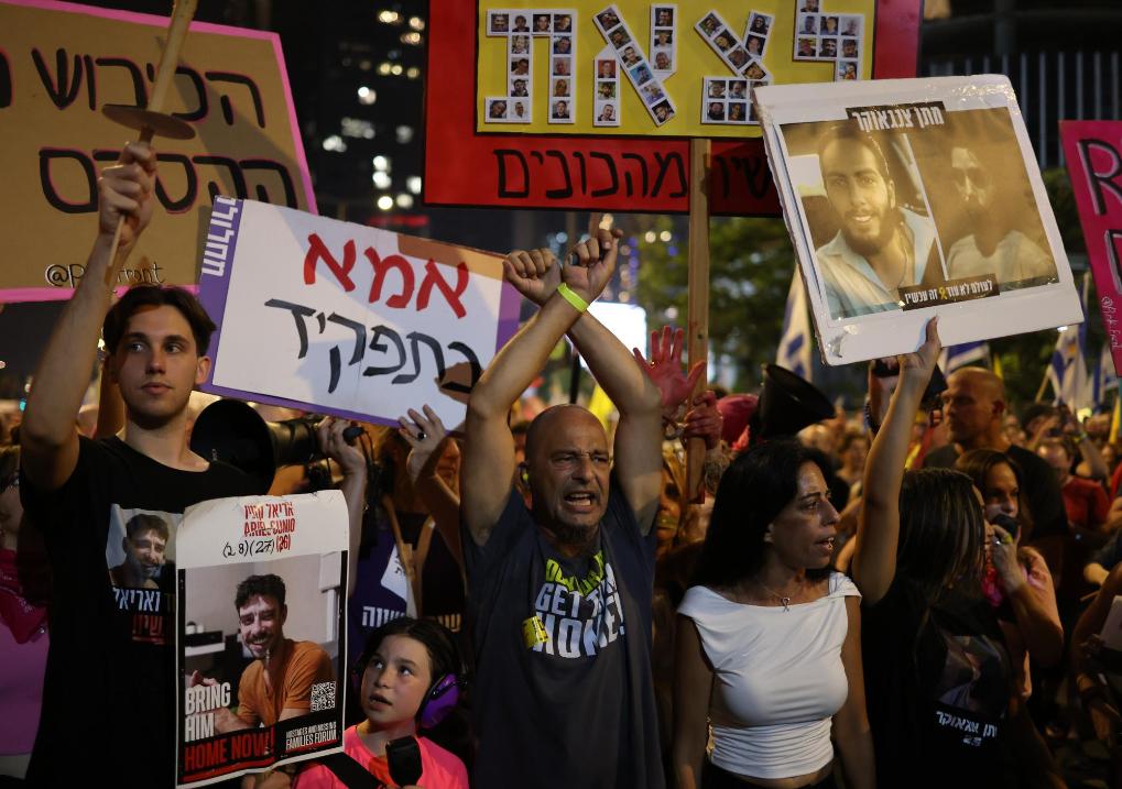 8月9日,以色列民众手持被扣押人员的海报在特拉维夫参加游行集会。新华社发(贾马尔·阿瓦德摄)