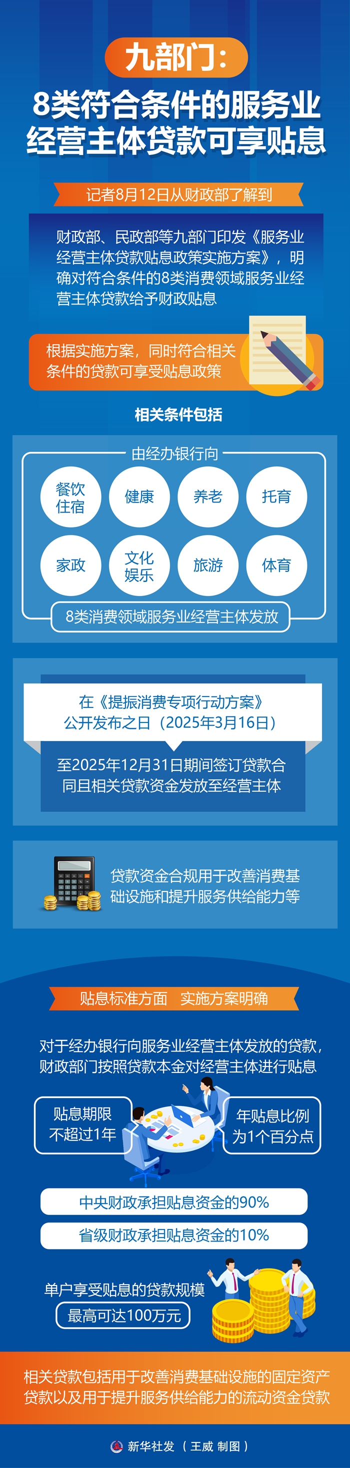 新华社北京8月12日电(记者申铖)记者12日从财政部了解到,财政部、民政部等九部门印发《服务业经营主体贷款贴息政策实施方案》,明确对符合条件的8类消费领域服务业经营主体贷款给予财政贴息。