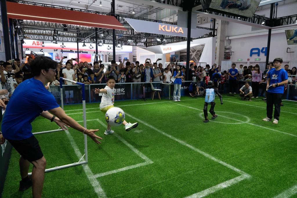 8月8日,观众在2025世界机器人大会上与机器人踢足球。新华社记者 谢晗 摄