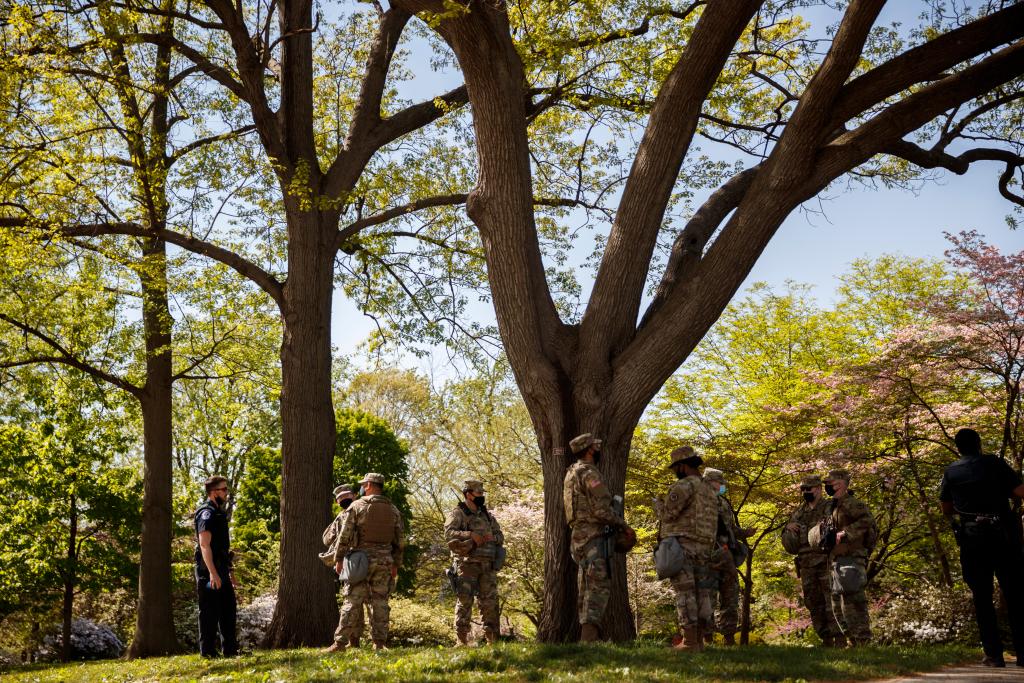 2021年4月20日,在美国首都华盛顿特区,国民警卫队成员在国会附近警戒。新华社发(沈霆摄)