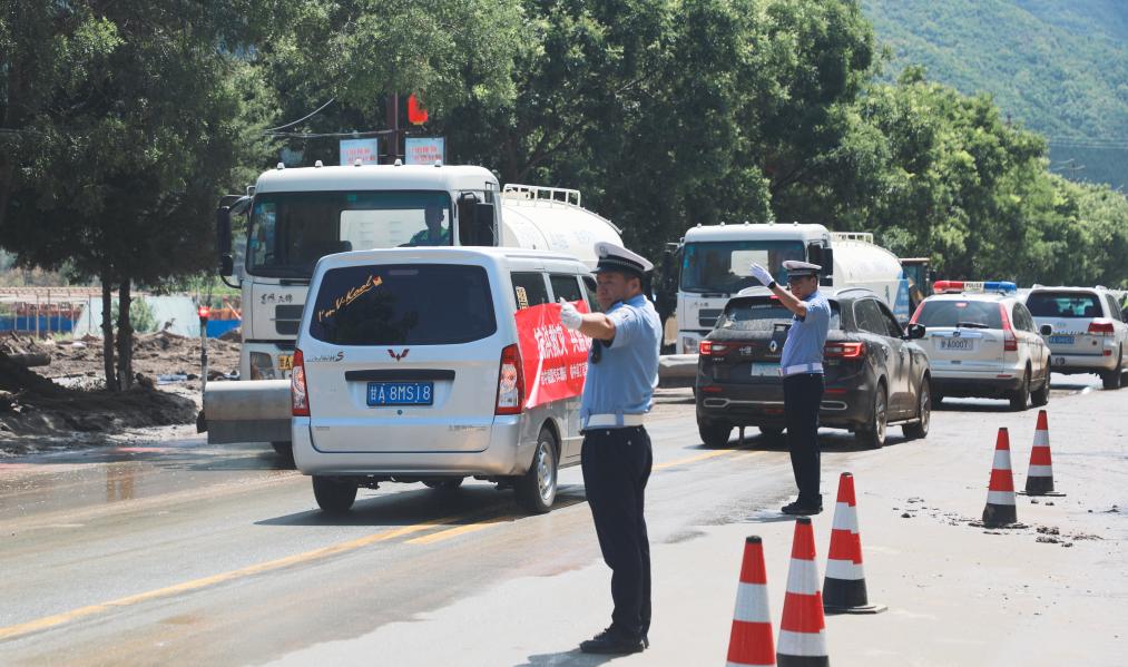 8月11日,交警在榆中县境内的省道104线上疏导交通。新华社发