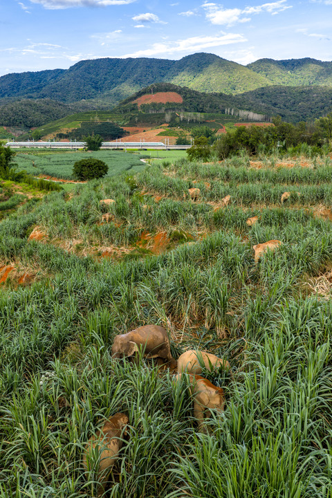 “然然家族”野象在云南省西双版纳州景洪市大渡岗乡觅食。远处,一列动车从中老铁路上驶过(8月10日摄)。