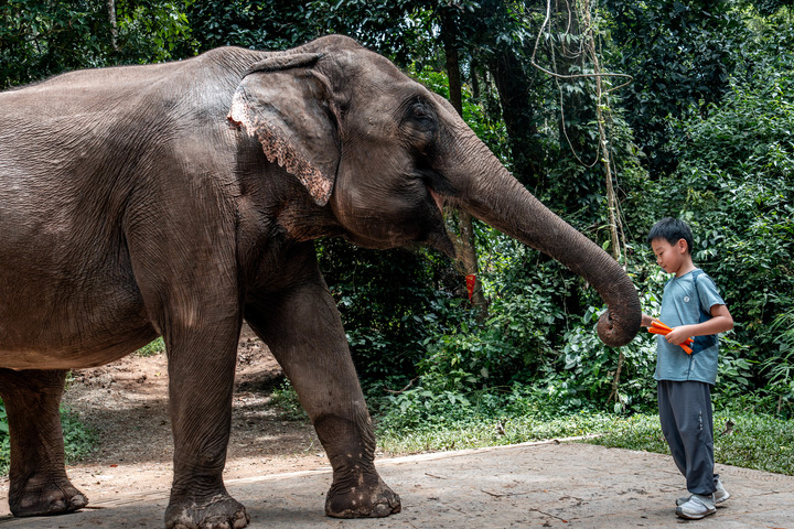 一名参加研学活动的男孩在野象谷给大象喂食胡萝卜(8月10日摄)。