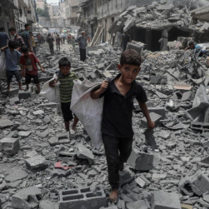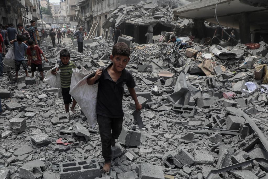 8月8日,孩子们在加沙城以军袭击后的废墟上搬运物品。新华社发(里泽克·阿卜杜勒贾瓦德摄)