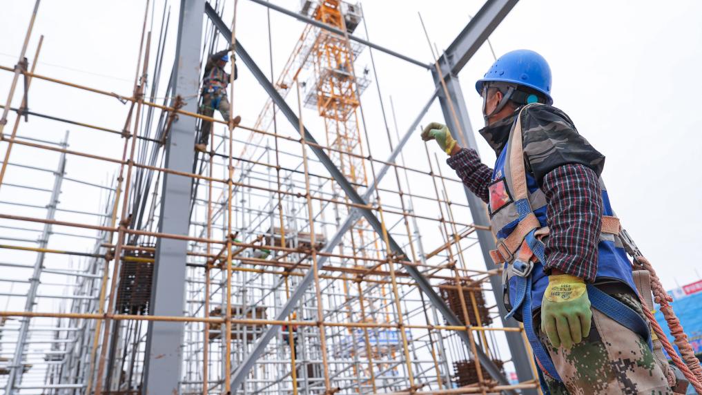 2025年6月1日,在位于宁夏银川市闽宁镇的闽宁产业园内,工人在宁夏山海饲料有限公司年产12万吨反刍饲料项目建设现场施工。 新华社记者 杨植森 摄