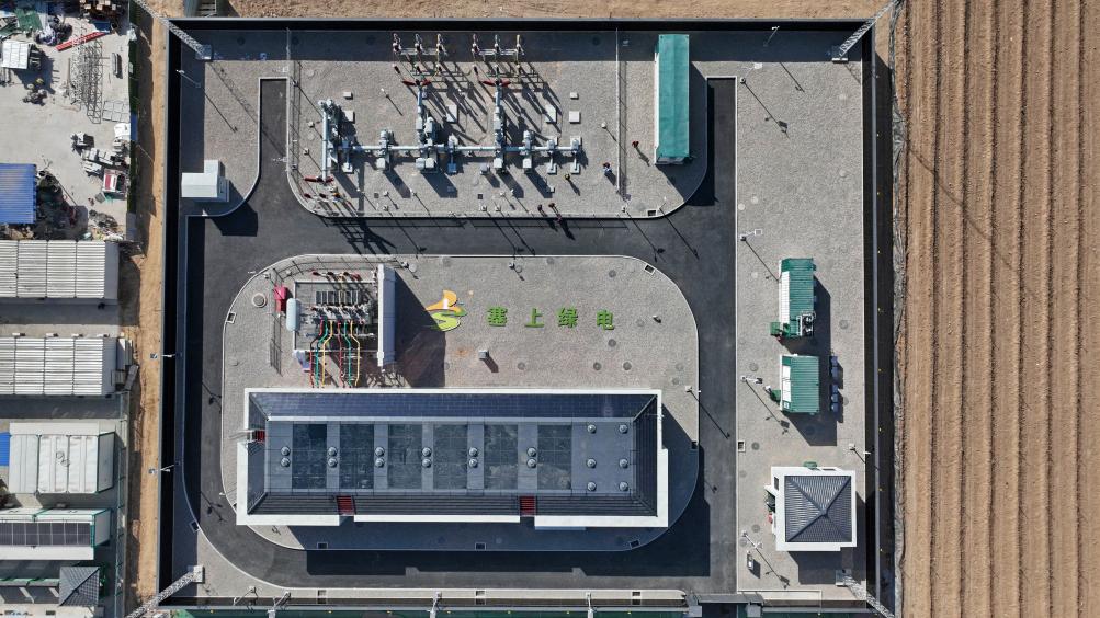 宁夏首座“数智化”110千伏绿色变电站在银川市永宁县闽宁镇正式建成投用,将为闽宁“绿电小镇”提供供电保障(无人机照片,2025年2月27日摄)。新华社记者 王鹏 摄