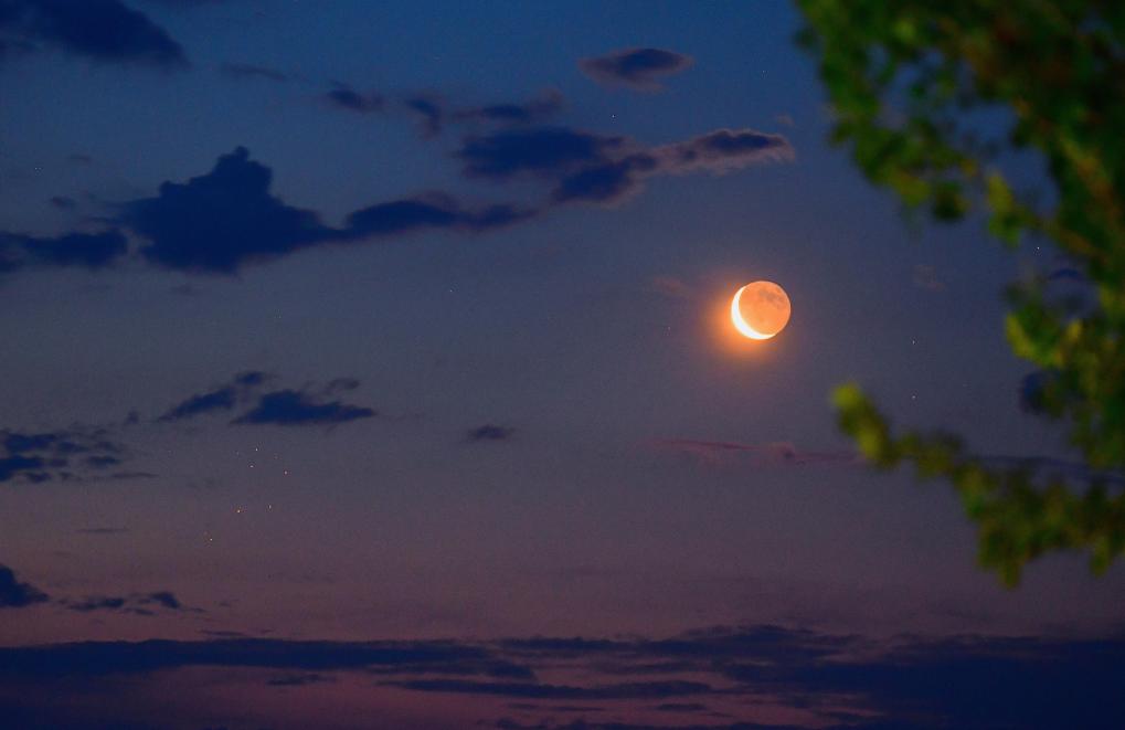 2025年6月23日,在黑龙江齐齐哈尔市克钦湖拍摄的月伴昴星团。(王勇刚 摄)