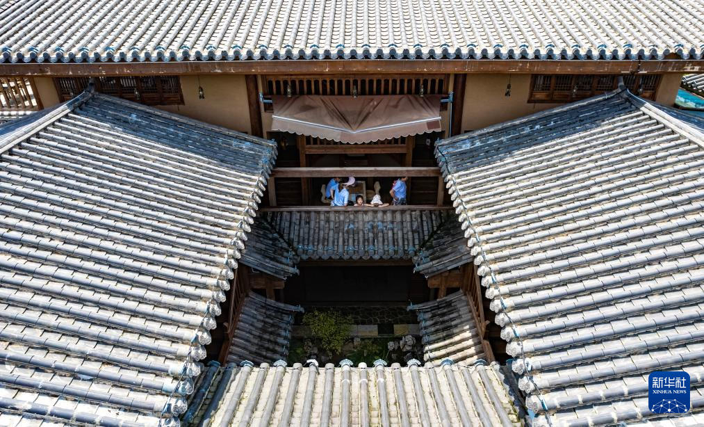 7月27日,游客在乐居村“一颗印”式建筑内游玩(无人机照片)。