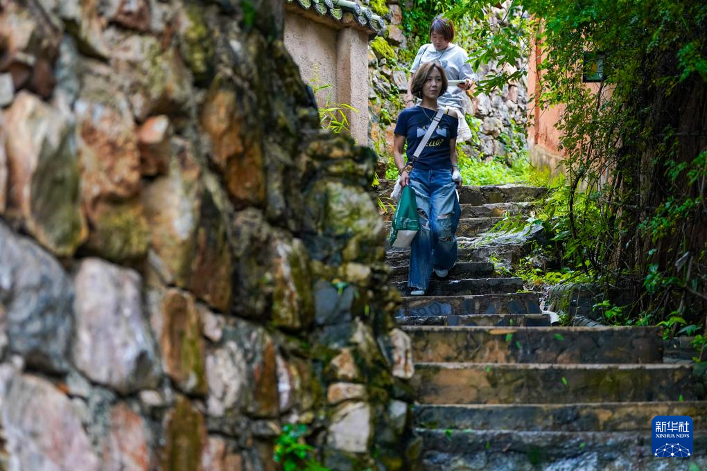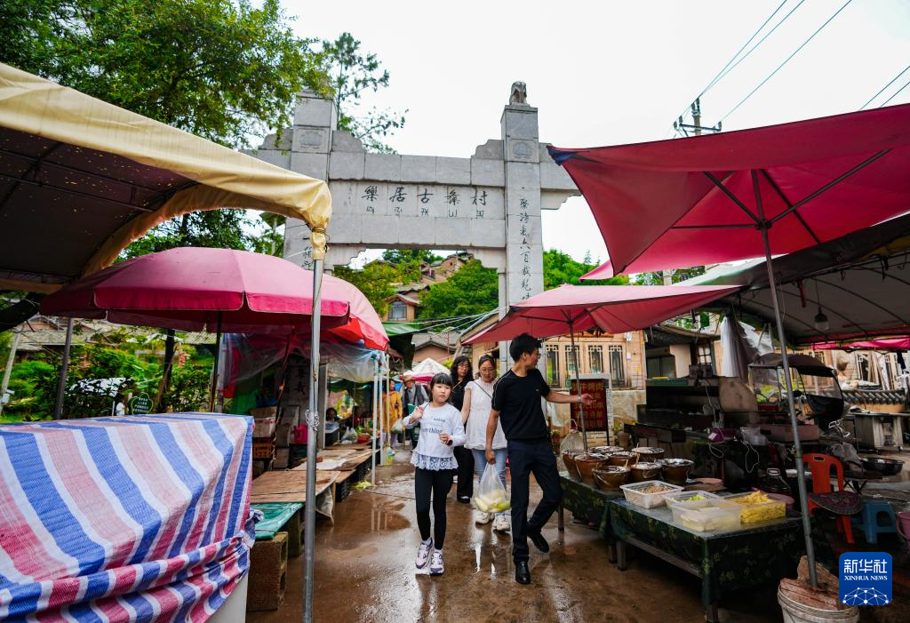 7月27日,两名游客在乐居村游玩时经过村内菜市场。
