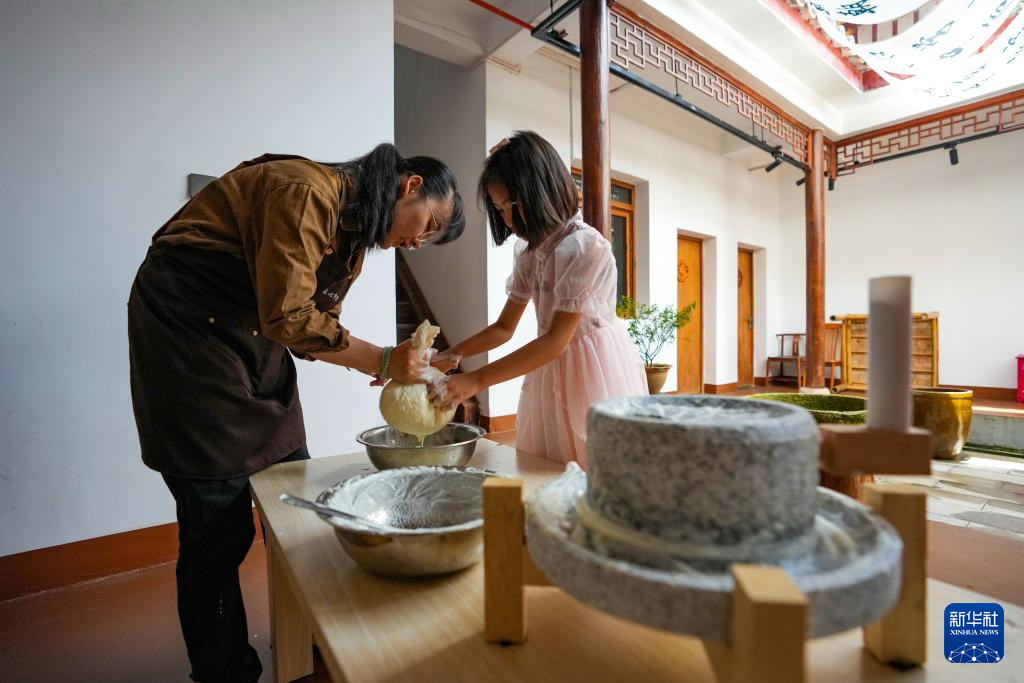 7月27日,小朋友在乐居村一家豆腐馆内体验豆浆制作。