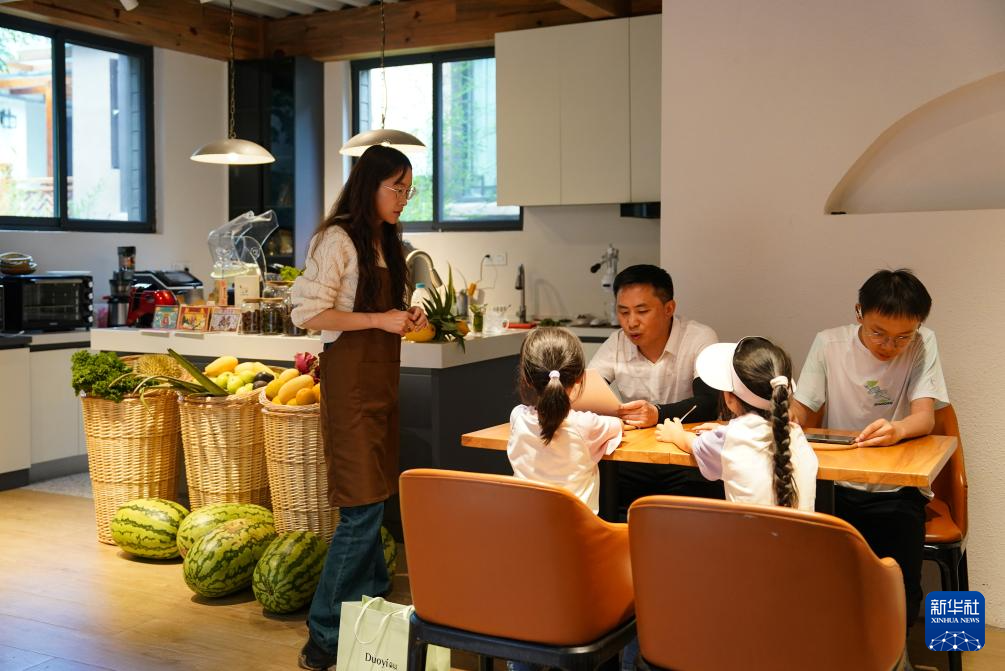 7月27日,乐居村新村民、青年创业者段俊玉(左一)在位于乐居村的店铺内为客人点单。