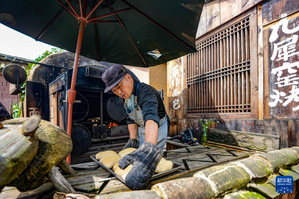 7月27日,游客在乐居村九犀面包店内品尝面包。