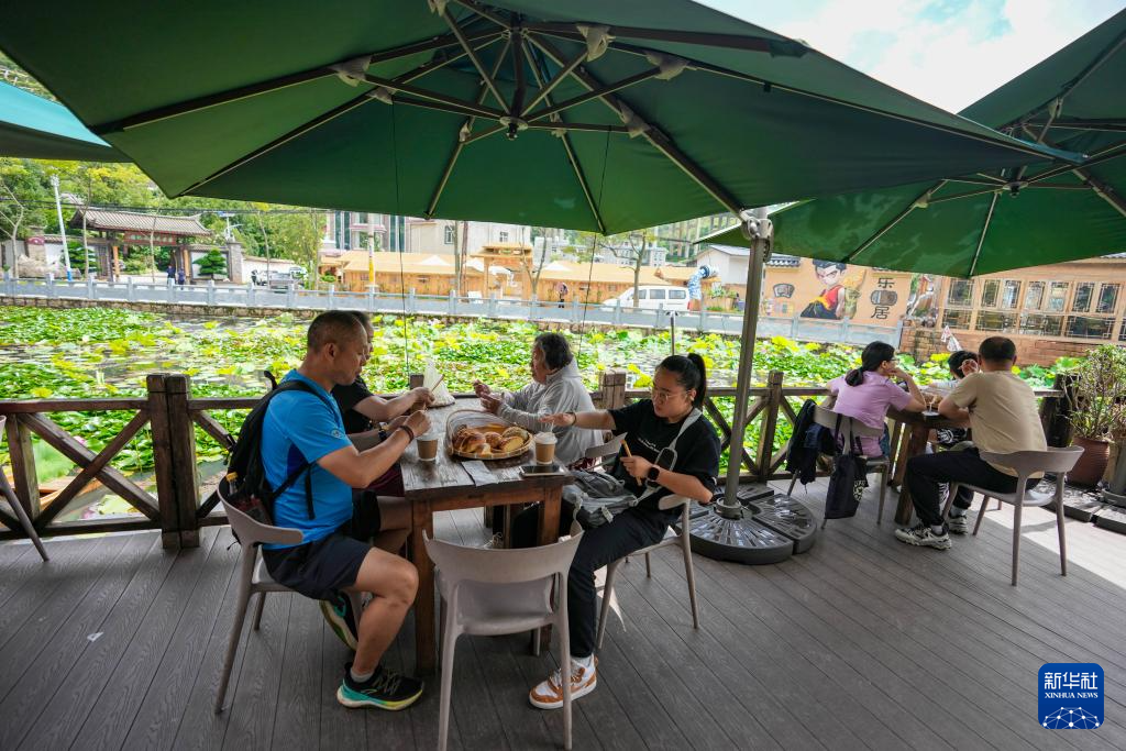 7月27日,游客在乐居村一家咖啡店内打牌休闲。