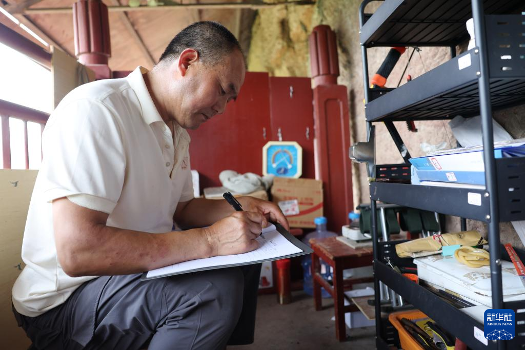 牟常有在麦积山石窟157窟前填写文物修复施工日志,为修复工作做准备(7月16日摄)。