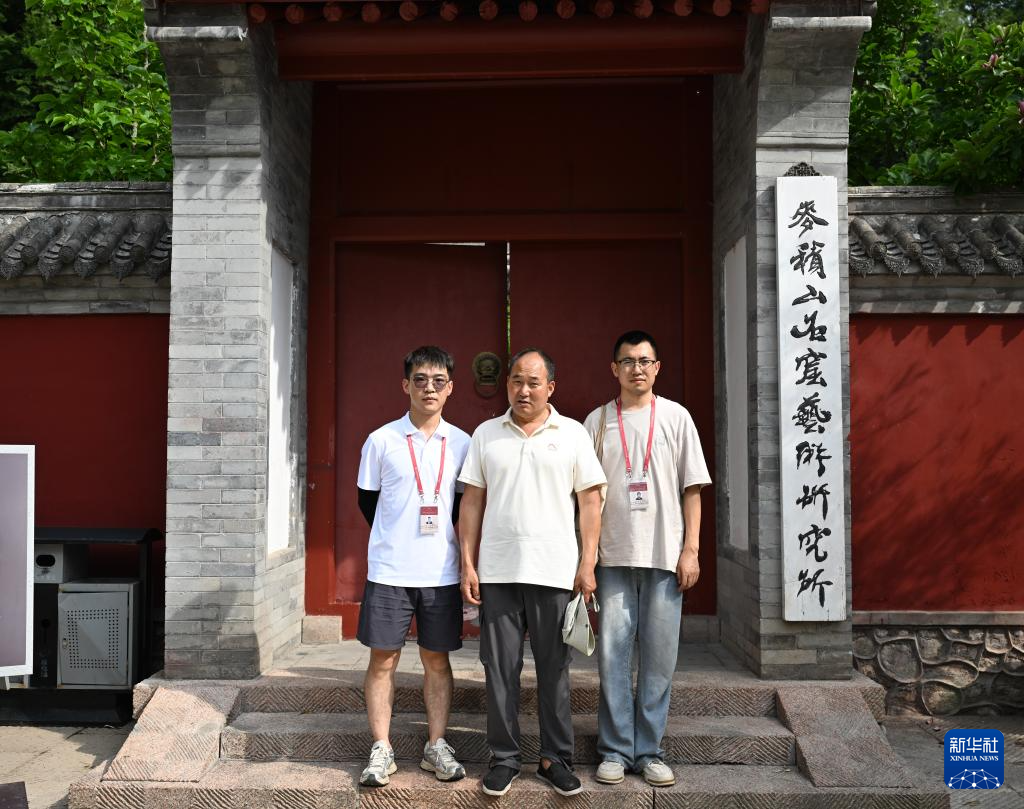 完成一天修复工作的牟常有(中)与徒弟李浩亮(右)、于佑樘在麦积山石窟艺术研究所前合影(7月16日摄)。