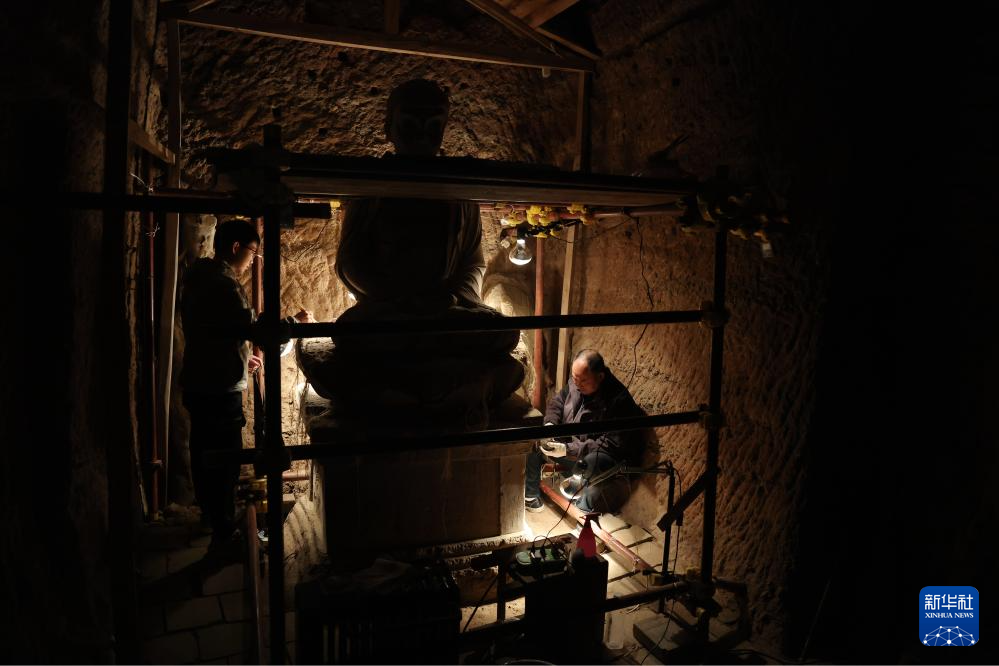 牟常有(右)和徒弟何举在麦积山石窟133窟内修复塑像(2024年11月2日摄)。