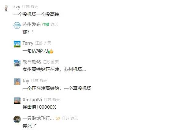 “苏州发布”评论区截图(冷知识:其实泰州是没高铁站)