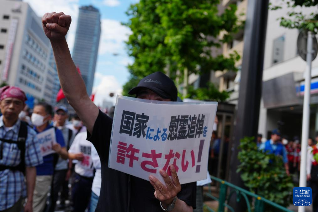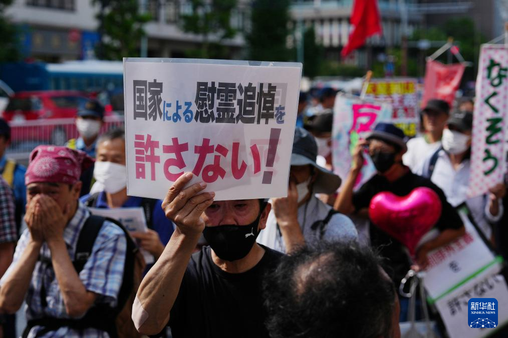 8月15日,民众在日本东京街头参加游行示威,要求日本政府正视并承担侵略责任。新华社记者 贾浩成 摄