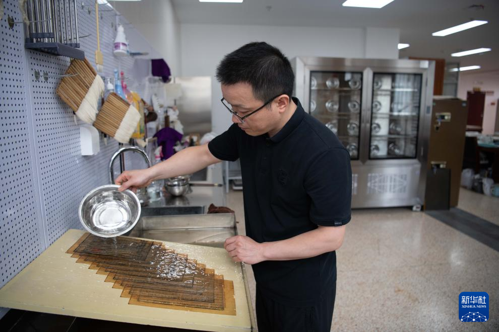 6月24日,在安徽省图书馆内,古籍修复师臧春华在清洗书叶。