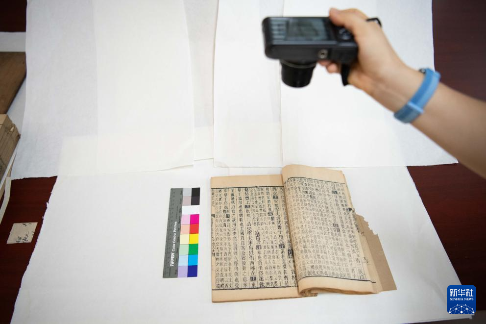8月5日,在安徽省图书馆内,古籍修复师周亚寒在修复古籍前进行拍照留存。