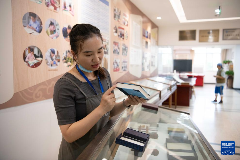 8月5日,在安徽省图书馆内,古籍修复师耿宁在介绍书籍装帧形式。