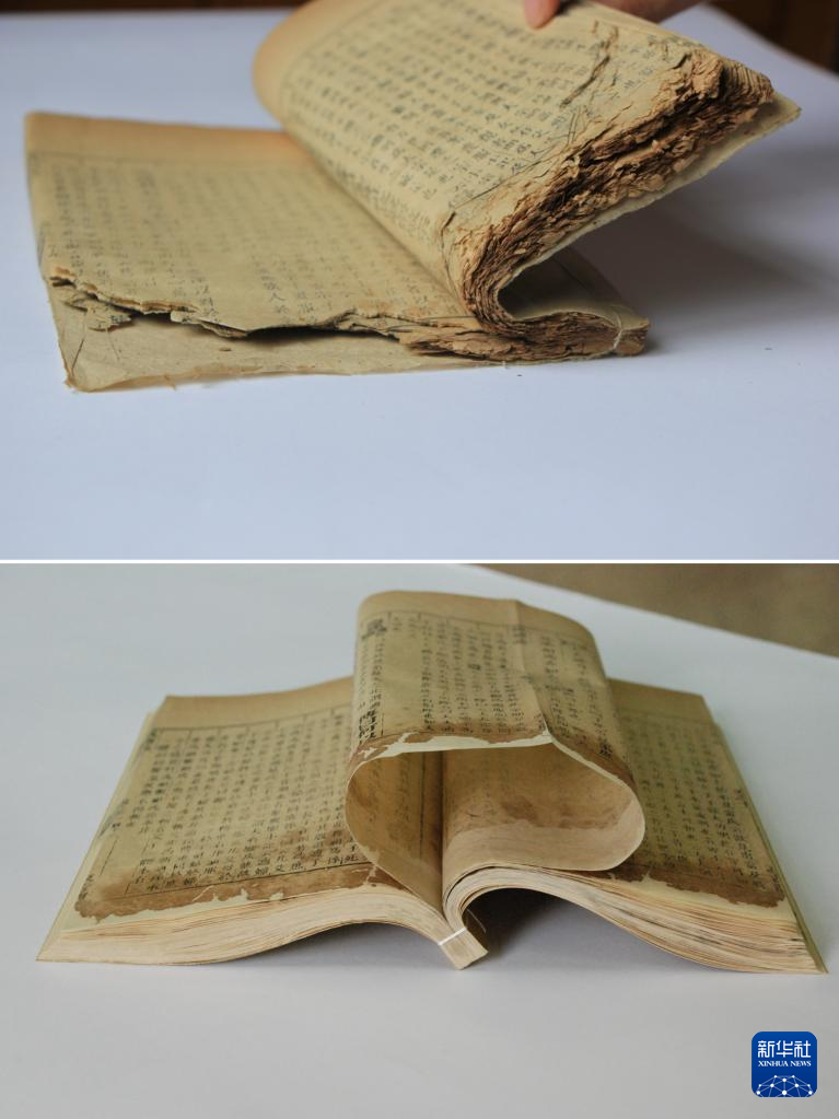 这是古籍修复前后的对比图(上图为修复前的古籍,下图为修复后的古籍)。