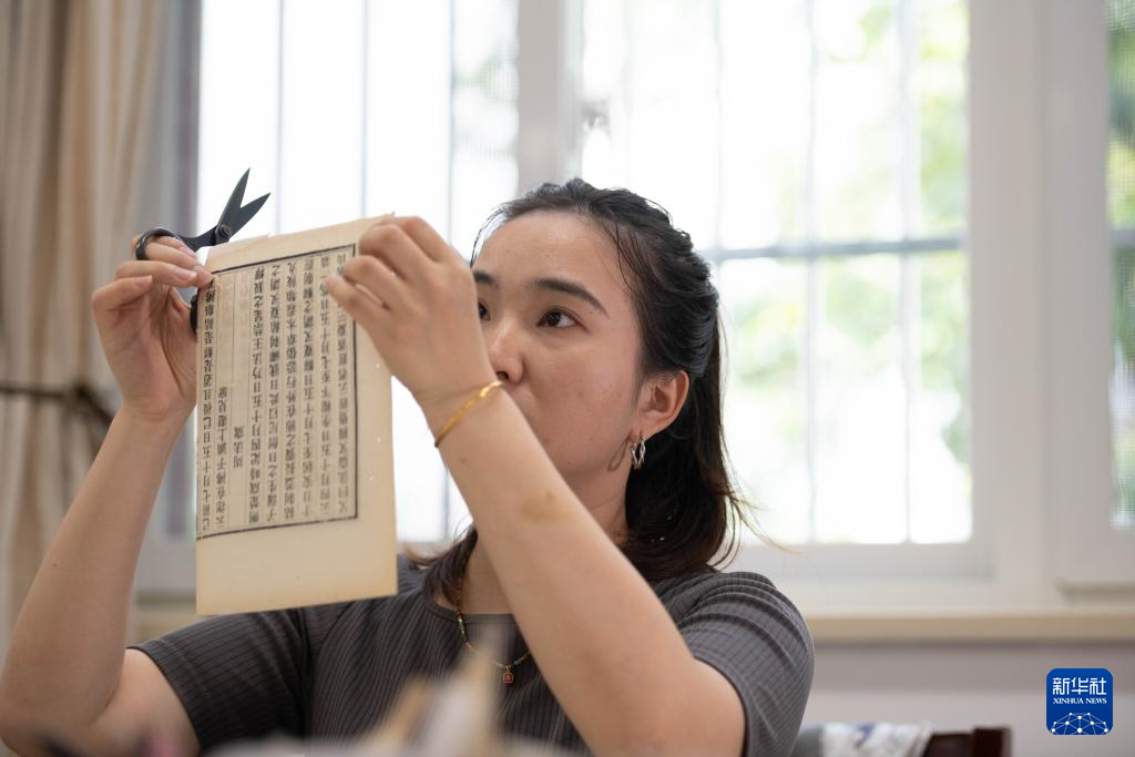 6月4日,在安徽省图书馆内,古籍修复师耿宁在修剪书叶。