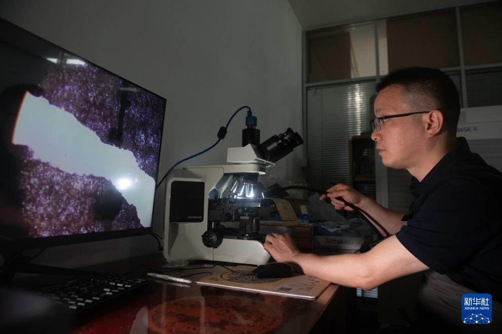 6月4日,在安徽省图书馆内,古籍修复师臧春华在使用专业仪器查看纸张纤维。