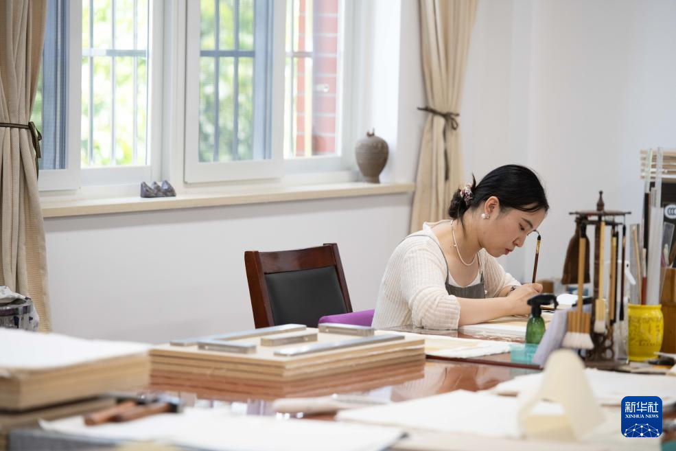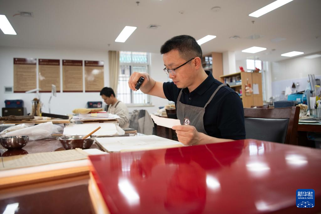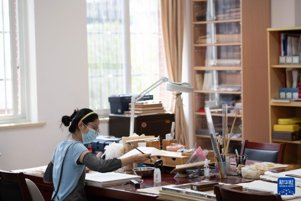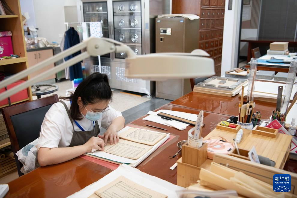 6月17日,在安徽省图书馆内,古籍修复师金鑫在进行古籍修复。