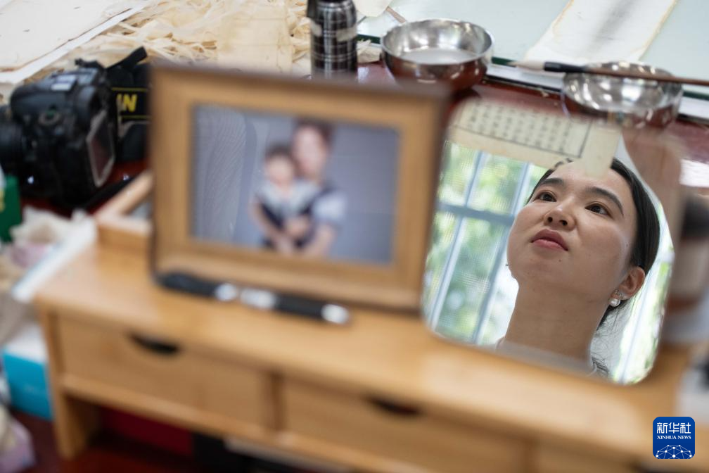 6月17日,在安徽省图书馆内,古籍修复师耿宁在修补书叶。