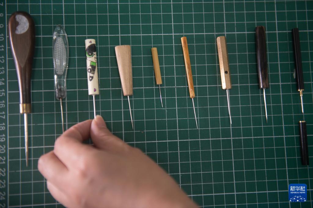 6月4日,在安徽省图书馆内,古籍修复师耿宁在介绍古籍修复所需使用的工具。
