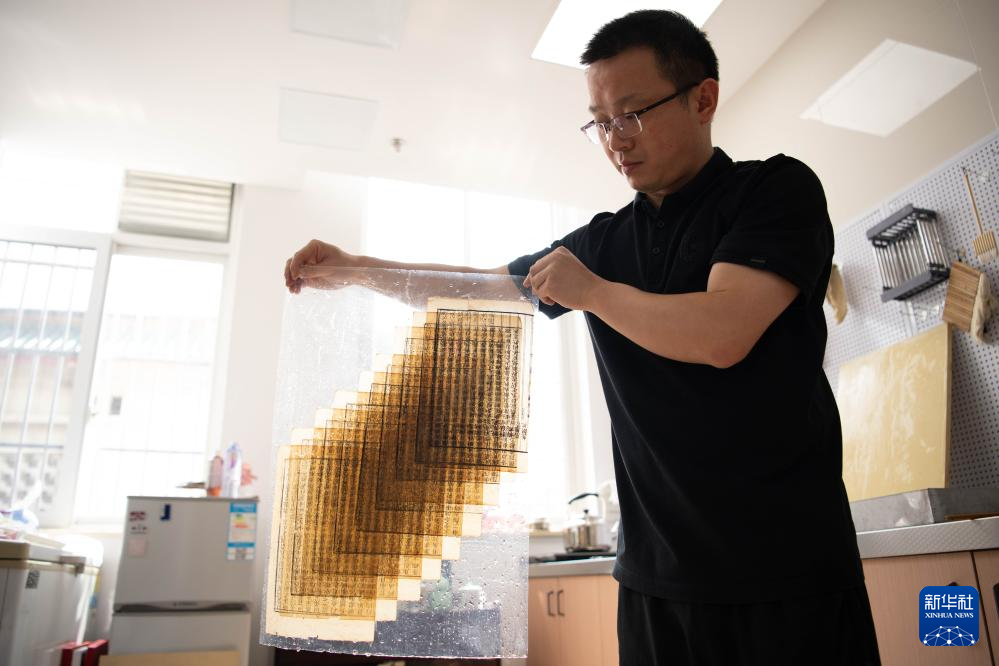 6月24日,在安徽省图书馆内,古籍修复师臧春华在揭开清洗后的书叶。
