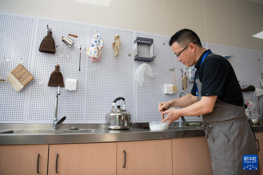 8月5日,在安徽省图书馆内,古籍修复师臧春华在调制古籍修复所需使用的浆糊。